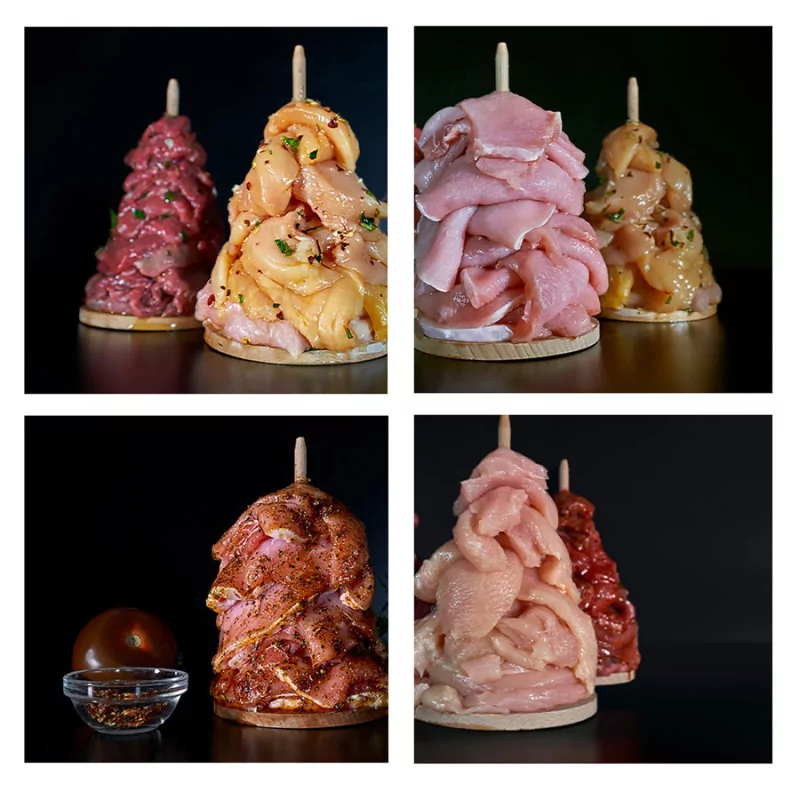 Pour la GMS : Le support en bois mini kebab ou mini gyros de table séduit la grande distribution. Les supermarchés vendent aux amateurs de barbecue et de viande de plus en plus de piques à viande prêtes à être grillées. La saison des barbecues est de plus en plus longue et ne se limite plus à l'été.