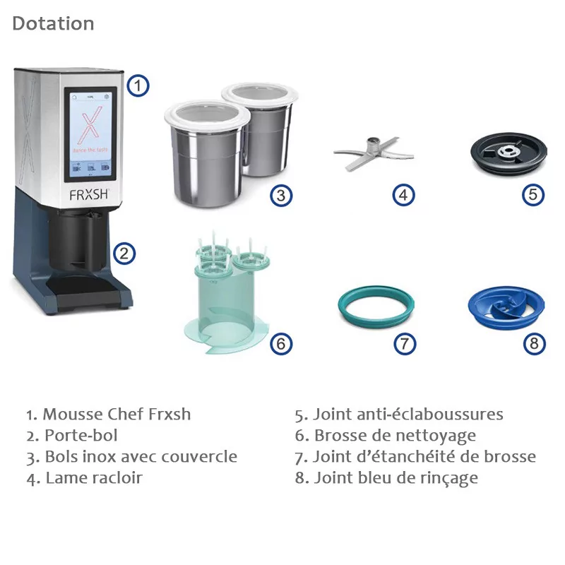Note : Deux pack sont proposés à la vente : le Mousse Chef Starter avec 2 bols inox et le Mousse Chef avec 14 bols inox. Les autres équipements sont strictement identiques.