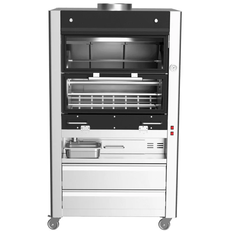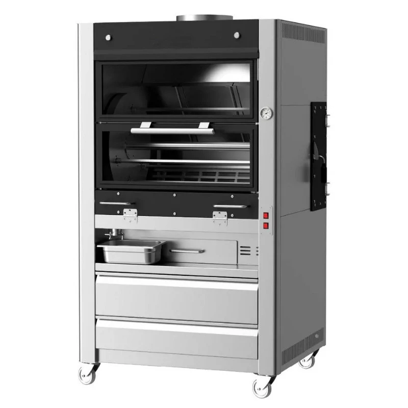 Conçue pour un usage intensif, cette rôtissoire professionnelle robuste et fonctionnelle est fabriquée en acier inoxydable de haute qualité. Elle fonctionne aussi bien avec du bois que du charbon de bois et se charge très facilement grâce à un compartiment situé à l'arrière de l'appareil, aisément accessible par des petites portes latérales.